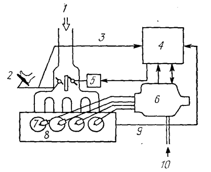 Рис. 1.2. Комплексная электронная система управления дизельным двигателем: 1- воздух; 2 - датчик открытия дроссельной заслонки; 3- степень открытия дроссельной заслонки; 4 - ЭБУ; 5- исполнительное устройство; 6- топливный насос высокого давления; 7- форсунки впрыска; 8- двигатель;9- частота вращения коленчатого вала двигателя; 10- топливо.