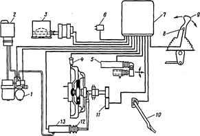 1 – гидравлический блок; 2 – резервуар гидросистемы; 3 – электродвигатель постоянного тока; 4 – датчик частоты вращения коленчатого вала двигателя; 5 – датчик контроля включения передач; 6 – датчик положения дроссельной заслонки; 7 – электронный блок; 8 – выключатель; 9 – рукоятка переключения передач; 10 – датчик положения педали подачи топлива; 11 – датчик частоты вращения ведущего вала коробки передач; 12 – рычаг сцепления; 13 – гидроцилиндр