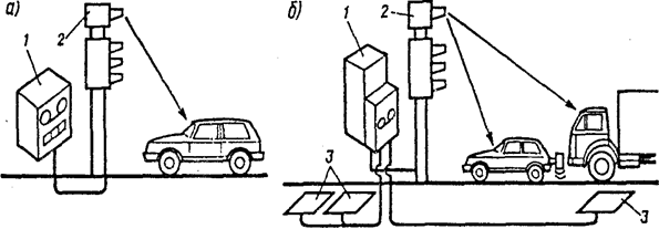 При одном из них (рис. 6.4, а) сеть установленных на городских улицах радиопередатчиков (радиомаяков 2) информирует водителей через обычные автомобильные радиоприемники о погодных условиях, сводках ДТП, ограничении скорости на отдельных магистралях, т. е. выдает информацию, содержащуюся в банке данных центра управления. Передаваемая информация является по сути информацией о прошедших уже событиях и фактах, т. е. запаздывающей по сравнению с временем движения автомобиля до пункта назначения.