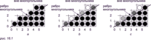 В алгоритмах разложения отрезка в растр, обсуждавшихся выше, цвет пиксела определялся интенсивностью или цветом единственной точки внутри области пиксела. Например, в алгоритме Брезенхема мы видим, что интенсивность пикселов определялась местоположением одной точки пересечения отрезка и границы пиксела. Этот метод необходим для простых двухуровневых изображений, то есть черных или белых, цвета многоугольника или цвета фона. В результате получается характерное ступенчатое или зазубренное ребро многоугольника или отрезок. Основной причиной лестничного эффекта является то, что дискретность отрезка или ребра недостаточна для того, чтобы соответствовать дискретным пикселам экрана дисплея.