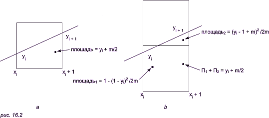 Интенсивность для первого пиксела предполагает, что отрезок начинается с адреса пиксела. Результаты для отрезка с тангенсом угла наклона m = 5/8 и восемью уровнями интенсивности представлены на рис. 16.1c. Распространить работу алгоритма на другие октанты можно тем же способом, что и для основного алгоритма Брезенхема.