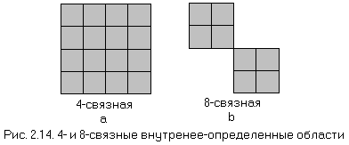 Внутренне- или гранично-определенные области могут быть 4-или 8-связными. Если область 4-связная, то любого пиксела в области можно достичь с помощью комбинации движений только в 4 направлениях: налево, направо, вверх, вниз. Для 8-связной области пиксела можно достичь с помощью комбинации движений в двух горизонтальных, двух вертикальных и 4 диагональных направлениях (рис. 2.14).