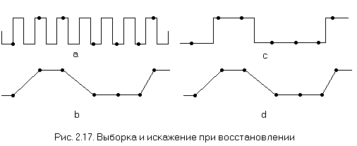 Рассмотрим, например, сигнал, изображенный на рис. 2.17,а. Второй сигнал более низкой частоты изображен на рис. 2.17,с. Если сделать выборки с одинаковой частотой из обоих сигналов (точки отмечены маленькими кружками), то восстановленные сигналы, показанные на рис. 2.17,b и d, идентичны. Рис. 2.17,d называется искажением выборки, показанной на рис. 2.17,b и, следовательно, сигнала на рис. 2.17,а. Для высокочастотного сигнала (рис. 2.17,а) выборка проведена с недостаточной частотой. Для предотвращения искажения следует проводить выборку сигнала с частотой, по крайней мере вдвое превышающей наибольшую частоту сигнала. Недостаточная выборка приводит к тому, что высокопериодичные изображения визуализируются неверно. Например, ограда забора или подъемные жалюзи могут выглядеть как несколько широких полос, а не как много отдельных, более узких полосок.