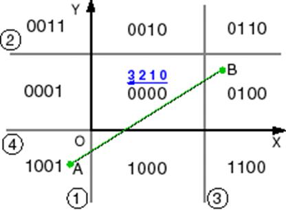 В алгоритме Сазерленда-Коэна отрезок тоже разбивается сторонами окна. Отличие состоит в том, что здесь не производится проверки попадания точки пересечения внутрь окна, вместо этого каждая из пары получающихся частей отрезка сохраняется или отбрасывается в результате анализа кодов ее концевых точек. Для определения той из девяти областей, которой принадлежит конец ребра, вводится четырехразрядный (битовый) код. Крайний правый бит кода считается первым. В соответствующий бит заносится 1 при выполнении следующих условий: