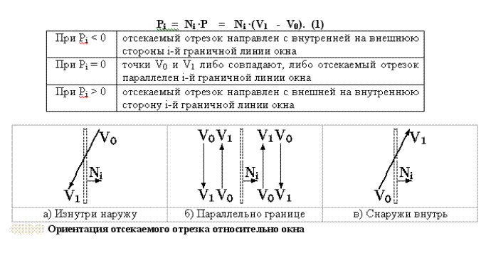 Ключом к алгоритму Сазерленда-Коэна является информация о том, что одна из концевых точек отрезка лежит вне окна. Поэтому тот отрезок, который заключен между этой точкой и точкой пересечения, можно отвергнуть как невидимый. Фактически это означает замену исходной концевой точки на точку пересечения. В содержательных понятиях алгоритм Сазерленда - Коэна формулируется следующим образом: