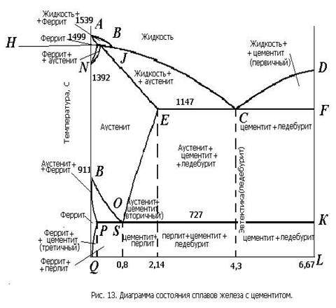 Диаграмма Fе-Fе3С. На рис. 13 приведена диаграмма состояния сплавов железа с цементитом. На горизонтальной оси концентраций отложено содержание углерода от 0 до 6,67 %. Левая вертикальная ось соответствует 100 % содержанию железа. На ней отложены температура плавления железа и температуры его полиморфных превращений. Правая вертикальная ось (6,67 % углерода) соответствует 100 % содержанию цементита. Буквенное обозначение точек диаграммы принято согласно международному стандарту и изменению не подлежит.