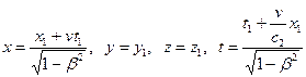 Релятивистские формулы, приводящие к инвариантности интервала, называются преобразованиями Лоренца. Они указывают, как перейти от координат инерциальной системы отсчета (включая время), которая движется со скоростью v вдоль положительного направления оси х. Преобразования имеют вид