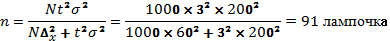 Пример. Какова должна быть численность выборки, чтобы с вероятностью 0,997 предельная ошибка средней продолжительности горения лампочек не превышала 60 часов. Известно, что объем генеральной совокупности 1000 лампочек, а среднее квадратическое отклонение 200 ч.