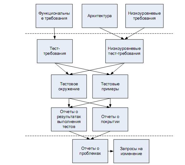 Согласно этим требованиям по системным и функциональным требованиям разработчиками тестов (test procedure developers) создаются тест-требования – документы, в которых подробно описано то, какие аспекты поведения системы должны быть протестированы. На основании описания архитектуры создаются низкоуровневые тест-требования, в которых описываются аспекты поведения конкретной программной реализации системы, которые необходимо протестировать.