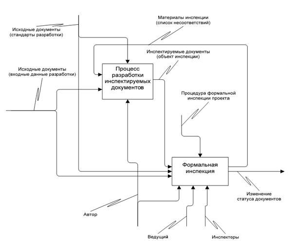 Независимость проверки обеспечивается тем, что она осуществляется инспекторами, не участвовавшими в разработке инспектируемого документа. Входами процесса формальной инспекции являются инспектируемые документы и исходные документы, а выходами – материалы инспекции, включающие список обнаруженных несоответствий и решение об изменении статуса инспектируемых документов. Рис. 1.16 иллюстрирует место формальной инспекции в процессе разработки программных систем.