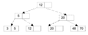 Рассмотрим особенности выполнения операции включения на примере. Пусть в В+ дерево порядка 1 включаются те же элементы и в том же порядке, что и в В-дерево, рассмотренное ранее (Рис. 7.9 – Рис. 7.14): 20, 12, 48, 3, 5, 70, 101.