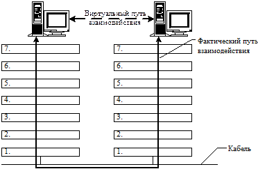 Несмотря на то, что каждый уровень может взаимодействовать только с тем же уровнем на другом компьютере (7 с 7, 3 с 3 и т.д., но не 7 – 6 или 3 – 6), фактически взаимодействие происходит только между соседними уровнями одного компьютера. Так, 4 уровень компьютера А, взаимодействуя с тем же 4 уровнем компьютера В, на самом деле взаимодействует с соседним себе 3 уровнем, 3 со 2 и т.д. до 4 уровня компьютера В (рис. 3).