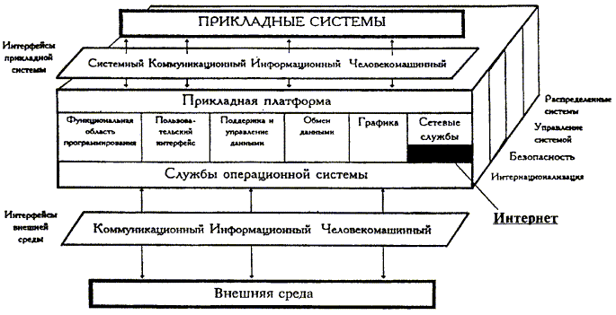 - внешнюю среду (внешняя среда – это системные элементы, внешние по отношению к прикладной платформе и прикладному ПО, в т.ч. все периферийные устройства. Достоинством данной модели является выделение внешней среды в самостоятельный элемент, имеющий определенные функции и соответствующий интерфейс, и возможность ее применения для описания систем, построенных на основе архитектуры «клиент-сервер»);