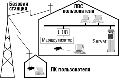 С помощью этой технологии к Интернет можно подключить как индивидуальных пользователей, так и локальные сети. Для этого у абонента устанавливается радиомодем, который подключается к сетевой карте его компьютера или к хабу/маршрутизатору (в случае подключения локальной сети). Радиомодем соединен с направленной антенной, установленной на крыше здания. Антенна абонента направляется на базовую станцию провайдера. Связь между провайдером (точкой входа в Интернет) и клиентом осуществляется по радиоканалу (рис. 5).
