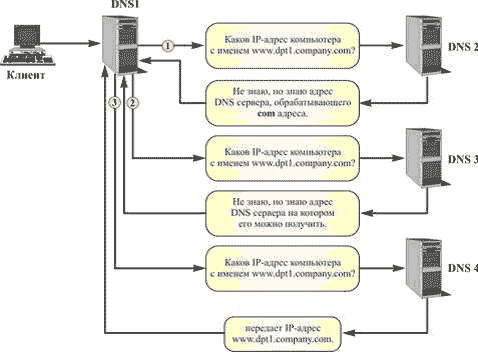 Представим, что вы обращаетесь к некоторому серверу по адресу www.dpt1.company.com (рис. 9) с помощью Web-клиента, установленного на вашем компьютере. В простейшем варианте ваша клиентская программа контактирует с DNS-сервером для того, чтобы получить IP-адрес искомого компьютера, и DNS-сервер возвращает искомый IP-адрес (рис. 10).