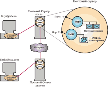 Синим цветом показано, как письмо передается от абонента с электронным адресом petya@abc.ru на почтовый ящик абонента с адресом sasha@xyz. com, а затем на его локальный компьютер.