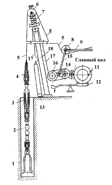 1 - долото, 2 – ударная штанга, 3 – раздвижная штанга, 4 – канатный замок, 5 –канат, 6 – блок, 7 – амортизатор, 8 – оттяжной ролик, 9 – балансирная рама, 10 – направляющий ролик, 11 – барабан, 12 – тормоз, 13 – желонка, 14 – кривошип, 15 – шатун, 16 – желоночный барабан, 17 – канат, 18 – мачта.