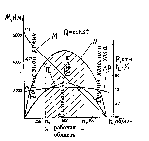 Под характеристикой турбины (рис.17) понимают зависимость ее мощности N, вращающего момента М, КПД h, перепада давления Dр от частоты вращения п при заданном расходе Q перекачиваемого через нее бурового раствора. Частота вращения вала соответствует частоте вращения роторного колеса, а вращающий момент равен сумме моментов всех ступеней: М = z т (здесь т - момент одной ступени).