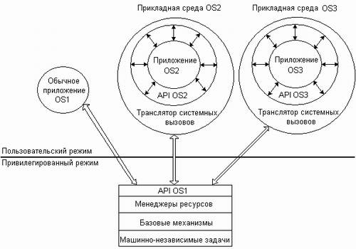 В ОС, построенных с использованием микроядерной концепции, таких как, например, Windows NT или Workplace OS, прикладные среды выполняются в виде серверов пользовательского режима. Один из наиболее очевидных вариантов реализации множественных прикладных сред основывается на стандартной многоуровневой структуре ОС. На рис. 2.2.3 операционная система OS1 поддерживает кроме своих «родных» приложений приложения операционных систем OS2 и OS3. Для этого в ее составе имеются специальные приложения — прикладные программные среды, — которые транслируют интерфейсы «чужих» ОС API OS2 и API OS3 в интерфейс своей «родной» ОС — API OS1.