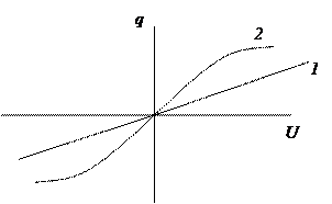 , входящий в выражение называют емкостью. Единица измерения емкости – фарада (Ф). В случае, если кулон-вольтная характеристика не является прямой линией (линия 2 на рис.1.14), то емкостной элемент называют нелинейным.