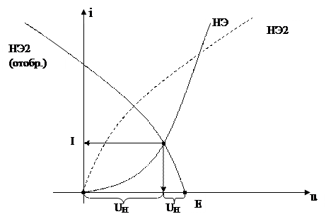 В случае если вместо линейного резистора в схеме рис.4.3,а используется второй нелинейный элемент (НЭ2), то также может быть использован метод опрокинутой характеристики. При этом из точки с координатой определяемой (4.4) строят опрокинутую ВАХ второго НЭ (рис.4.4). Проекции на оси координат из точки пересечения ВАХ и дают решение задачи.