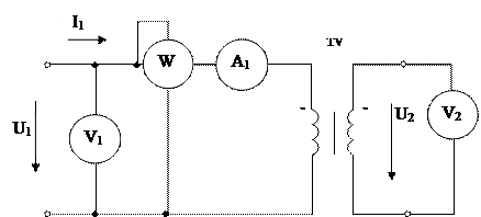 Напряжения на первичной и вторичной обмотках трансформатора измеряются вольтметрами, ток первичной обмотки – амперметром, а мощность, потребляемая от источника энергии – ваттметром. Поскольку внутренние сопротивления вольтметров считаются близкими к бесконечности, то током вторичной обмотки можно пренебречь. Через первичную обмотку проходит небольшой ток холостого хода