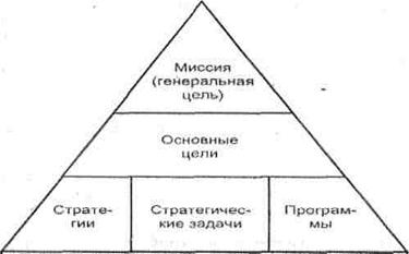 Миссия и цели. На вершине иерархической пирамиды находится миссия (генеральная цель) организации. Генеральная цель детализирует общественный статус организации и создает ориентиры фирмы для определения целей и стратегий на различных уровнях управления.