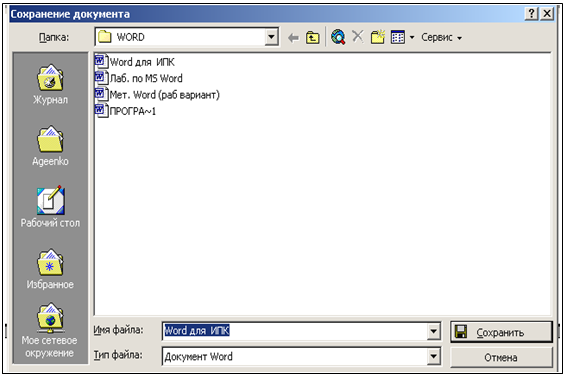 Для сохранения документа используется Команда Файл – Сохранить. Если это первое сохранение, то требуется выполнить команду Файл – Сохранить как и обязательно указать имя файла, его тип и имя папки, в которую он будет записан.
