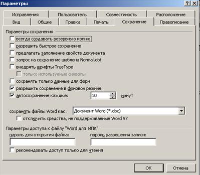 Можно задать автоматическое сохранение документов. Для этого используется команда Сервис – Параметры вкладка Сохранение.