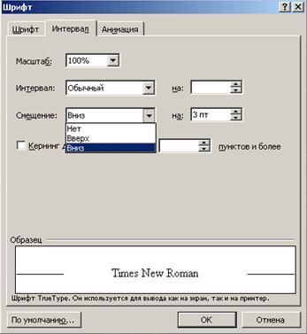 Вторая вкладка задает межбуквенный интервал и смещение текста относительно базовой строки. Межбуквенный интервал может быть разреженный или уплотненный. Расстояние между буквами задается в пунктах (пт). Поскольку размер шрифта также рассчитывается в пунктах, то степень разреженности или уплотненности текста зависит от выбранного размера шрифта.