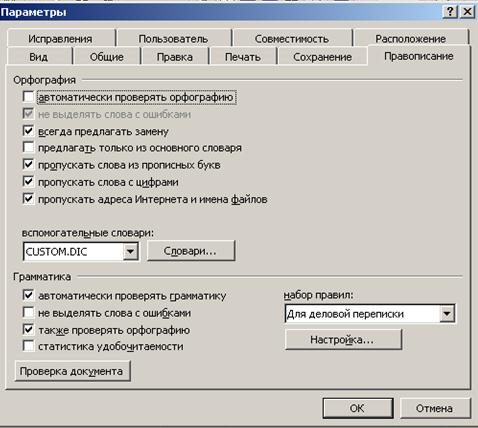 Включение и выключение проверки правописания осуществляется в команде Сервис – Параметры, вкладка Правописание.