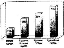 | РИС.9.6. Распределение числа случаев пожаров, при тушении которых для доставки воды использовали перекачку, по группам городов |