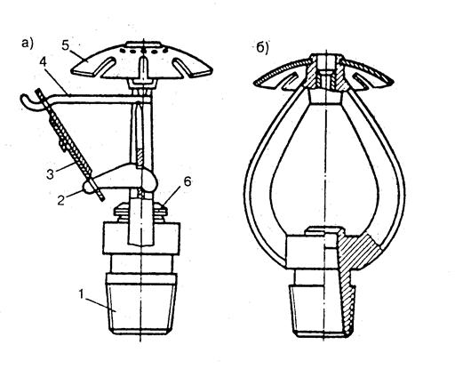 Устройство широко применяемого спринклера типа ОВС показано на рис.9.7 а. После того, как расплавится плавкий замок, ослабляются и раздвигаются рычаги и открывается клапан. В зависимости от максимально допустимой температуры в помещений при нормальных условиях эксплуатации оборудования и с учетом разброса по температуре расплавления замка спринклеры изготовляют на следующие температуры срабатывания: 72, 93,,141, 182°С.