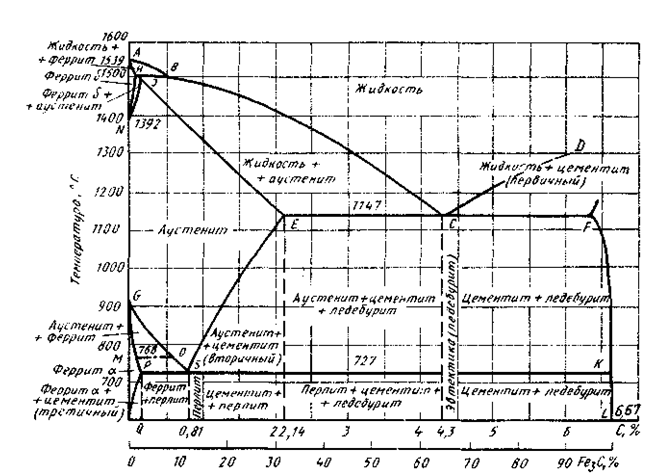 Точки А и Д соответствуют температурам плавления железа и цементита. Точки N (13920С) и (9100С) соответствуют полиморфному превращению, в чистом железе.