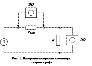 Величину мощности можно измерить косвенным методом, используя лишь один осциллограф (рис.1). Падение напряжения определяем по осциллографу. Величину тока в цепи определим через измерительный резистор, который включим сами в рабочую цепь.