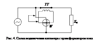 Более рациональным решением при увеличении рабочего тока считают не шунты, а применение трансформаторов тока, пусть отдельного, внешнего устройства, подключаемого в рабочую цепь. Схема подключения ваттметра с применением трансформатора тока показана на рис. 4.