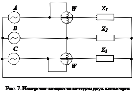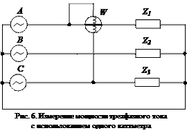 . Для этой цели необходим один ваттметр (рис.6). Недостаток метода: необходима перекоммутация ваттметров.