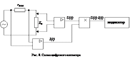 В рабочую цепь включается измерительный резистор (например, 1 Ом). С этого резистора снимается сигнал, пропорциональный току. С нагрузки считывается падение напряжения. На перемножителе (специальный усилитель с нелинейной характеристикой) получаем уровень напряжения, пропорциональный U(t)×I(t), который представляем на цифровом индикаторе.