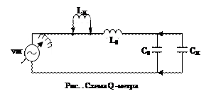 Суть прибора: первоначально без Lx, Cx параметрыконтура подобраны в резонанс. После подключения элемента, контур расстраивается, а изменением частоты индуктора его вновь настраивают в резонанс. Шкала проградуирована в единицах L, C. Основной недостаток Q-метра: собственные паразитные параметры не учитываются. Погрешность с измерением L и C резонансным методом приблизительно 2 %. Основной недостаток прибора: они стационарные.