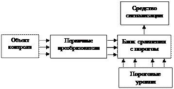 На объект контроля устанавливают датчики, имеющие аналоговый или пороговый релейный уровень. Первичные преобразователи формируют электрический сигнал определенной величины, в зависимости от состояния объекта. Эти сигналы сравниваются с некими пороговыми уровнями (могут быть различные для различных сигналов) и в случае превышения уровня блок сравнения выдает сигнал на средство сигнализации.