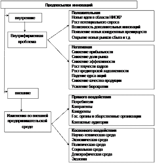 Говоря об инновационной деятельности, можно выделить две группы факторов, являющихся предпосылками к ее развитию: внутренние и внешние.