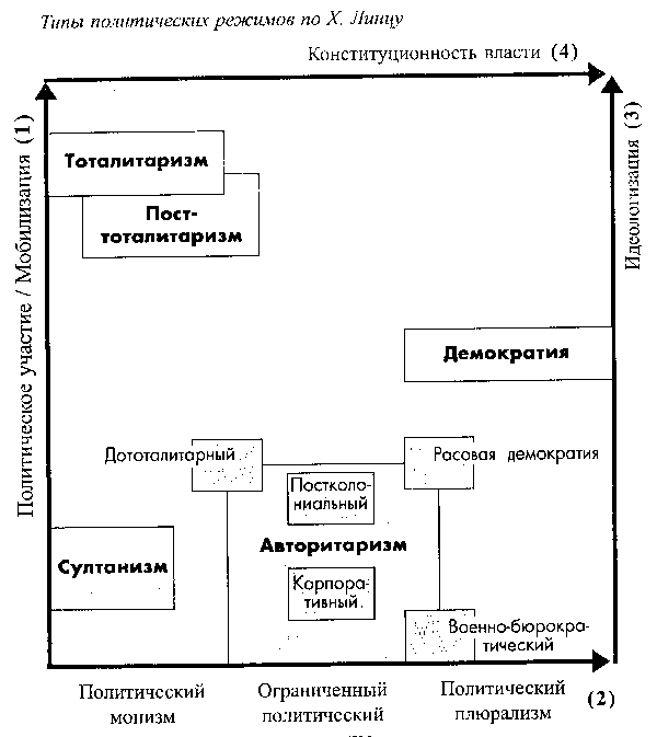 Как видно, на рисунке Линца начертаны четыре оси: 1) мобилизация; 2) плюрализм; 3) идеологизация; 4) конституционность власти.