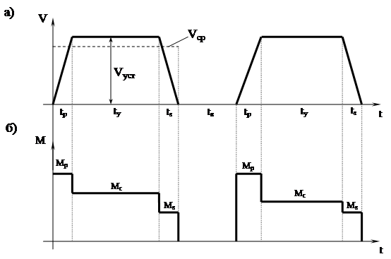 По мере подъема КБТ ее вес (Q) дискретно уменьшается и соответственно изменяется момент статического сопротивления (Мс) на валу приводного электродвигателя. Причем в период разгона КБТ момент Мр на валу электродвигателя будет больше статического момента Мс за счет дополнительного усилия для преодоления инерции при разгоне. При замедлении колонны момент Мз будет меньше статического момента на величину динамического момента при торможении. Так как время работы привода лебедки при подъеме КБТ прерывается паузами для отвинчивания, переноса и установки труб, спуска крюка с незагруженным элеватором, режим работы привода лебедки повторно-кратковременный, с относительной продолжительностью включения 25-40%.