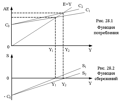 Изменение MPS графически отражается в изменении тангенса угла наклона прямой сбережения (рис. 2). Если MPC увеличивается (прямая С1 на рис.1), то MPS сокращается (прямая S2 на рис.2), что естественно ведет к увеличению доходов общества в целом.