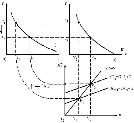 Согласно Кейнсу, равновесие на рынке товаров определяется AD= Y. Таким образом, денежный и товарный рынки взаимосвязаны через Y, I, r (рис. 1, а-в).