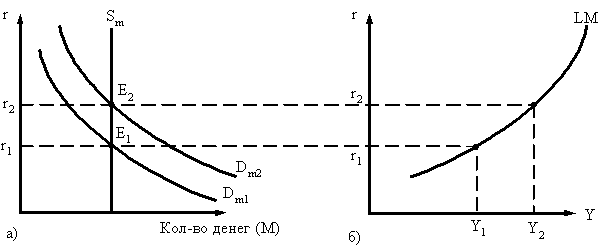 Денежный рынок. Рост национального дохода (Y1->Y2) увеличивает рост спроса на деньги (Dm1 -> Dm2). При неизменном предложении денег (Sm) это приводит к росту r (рис. 2,а). Таким образом, при национальном доходе Y2 (рис..2,б).