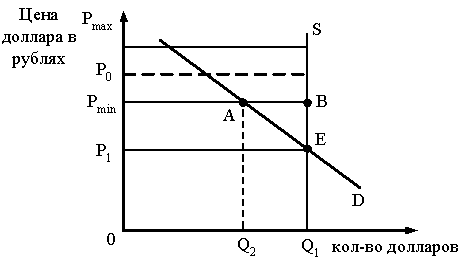 2. Фиксированный курс. Курс национальной валюты устанавливается Центральным банком, который берет на себя обязательство покупать и продавать любое количество иностранной валюты по установленному курсу. Обычно ЦБ устанавливает пределы свободных колебаний курса национальной валюты в целях макроэкономической стабилизации. Когда цена валюты приближается к верхней или нижней границе этих пределов, ЦБ проводит интервенции: приближение к нижнему пределу требует покупки ЦБ этой валюты в обмен на иностранную валюту или золото, и наоборот (рис.1).