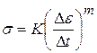 где σ – внешнее напряжение, вызывающее течение образца; K – коэффициент пропорциональности; m – показатель скоростной чувствительности (мера чувствительности сопротивления деформации к изменению скорости деформации; у металлов показатель гораздо меньше 1 (10-2), т.е. напряжение, вызывающее течение, почти не зависит от скорости деформирования. У смолы и нагретого стекла показатель близок или равен 1.).