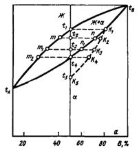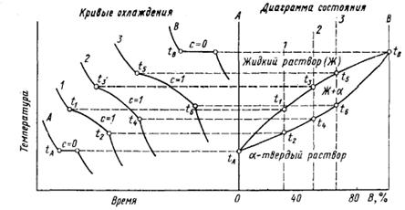 Для экспериментального построения диаграммы состояний сплавов, образованных компонентами А и В, необходимо изготовить серию сплавов, содержащих различные количества компонентов А и В. Для каждого такого сплава экспериментально строят кривые охлаждения и определяют по ним критические точки, т. е. температуры фазовых превращений. Полученные значения критических точек изучаемых сплавов откладывают на вертикальных линиях, соответствующих химическому составу этих сплавов. Затем соединяют критические точки, соответствующие определенным фазовым превращениям и получают линии диаграммы состояний.