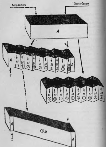 Если напряжение приложено так, как показано на рисунке, то увеличивается доля кристаллов 1, в которых направление сдвиговых смещений атомов согласуется с направлением действия нагрузки, а доля кристаллов 2 уменьшается. В предельном случае при А→М-переходе реализуется только один вариант смещения атомов, и общая относительная деформация соответствует относительному удлинению 10 %. Данная деформация намного превышает предельную упругую деформацию обычных металлов, но она накапливается не за счет необратимых сдвигов, а за счет направленного смещения А→М. Если вызвать обратное превращение, то вся эта деформация исчезнет, так как атомы вернуться в исходные положения, которые они занимали в решетке аустенита.